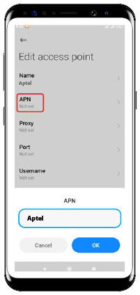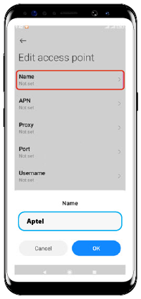 در پنجره باز شده در قسمت Name و APN کلمه ApTel را تایپ کنید.