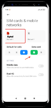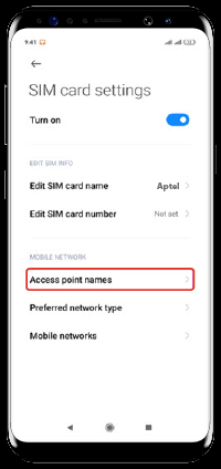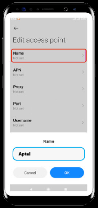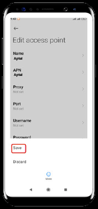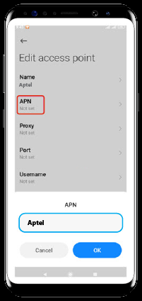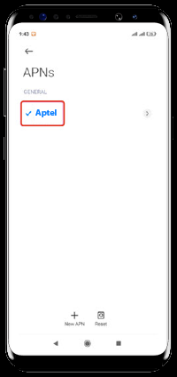 تنظیمات (Settings) ابتدا گزینه تنظیمات (Settings) را انتخاب نماییدسیمکارتها و شبکههای موبایل (SIM Cards & Mobile Networks) از منوی تنظیمات (Settings) گزینه سیمکارتها و شبکههای موبایل (SIM Cards & Mobile Networks) را انتخاب کنید.سیمکارت آپتل (ApTel) سیمکارت آپتل (ApTel) را انتخاب کنیدنامهای نقطه دستیابی (Access Point Names) گزینه نامهای نقطه دستیابی (Access Point Names) را انتخاب کنیدAdd APN (New APN) از طریق گزینه Add ، + یا New میتوانید نسبت به اضافه کردن یک APN جدید اقدام کنید.درج Aptel در قسمت Name و APN در پنجره باز شده در قسمت Name و APN کلمه ApTel را تایپ کنیدذخیره (Save) از طریق سه نقطه بالای صفحه یا قسمت بیشتر (More)، گزینه ذخیره (Save) را انتخاب کنید.انتخاب APN از لیست APN های قابل مشاهده ApTel را انتخاب و فعال کنید.